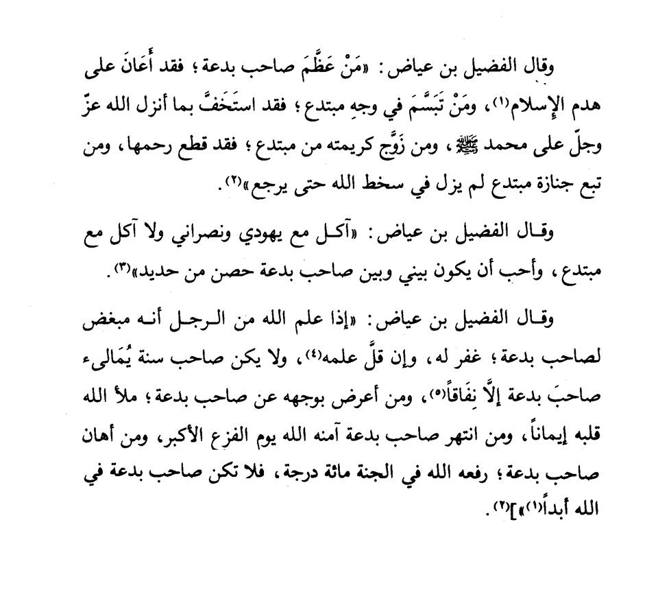Fudaid bin Iyad said; I will eat with a Jewish and Christian person but I won’t eat with an innovator. I would love to have an iron curtain between me and an innovator.