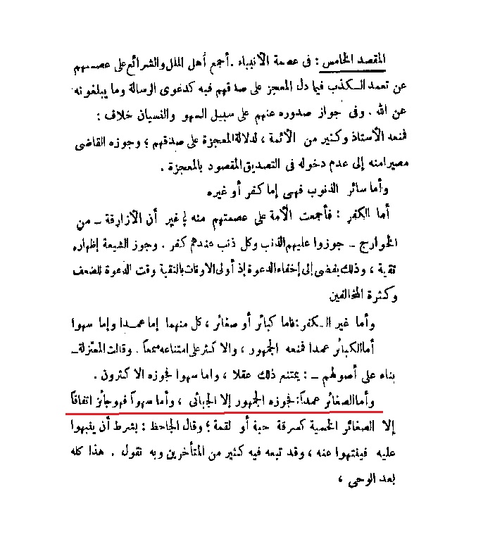 “But as for the non-humiliating minor sins: the majority of Ash’aris said it is possible and this is regardless if it is deliberate or inadvertent, and it is the position of Abu Ja’far al-Tabari. But some of Fuqaha and Mutakallims said it is impossible whether it is deliberate or inadvertent.”